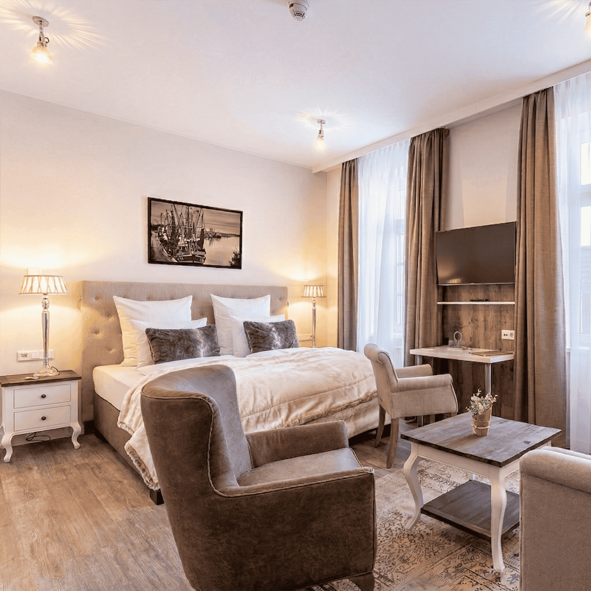 Die neuen GREET Suiten bieten einen atemberaubenden Blick auf die berühmten Greetsieler Zwillingsmühlen und sind mit erstklassigen Annehmlichkeiten ausgestattet. Unsere Gäste in allen Suiten können sich auf höchsten Komfort freuen.